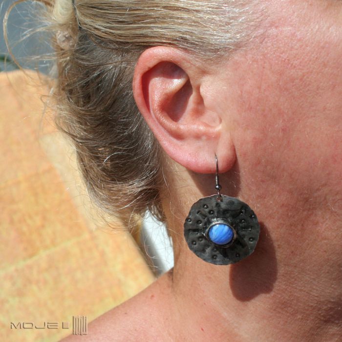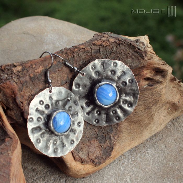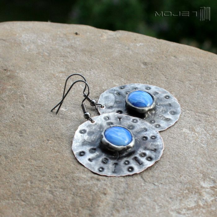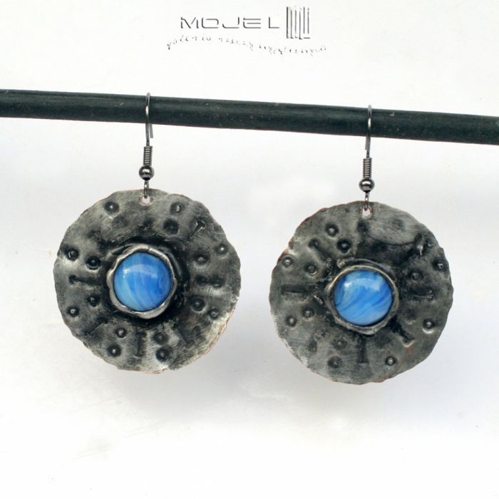 Okrągłe kolczyki z miedzi ze szklanym okiem. Kaboszony w kolorze nieba osadzone są na blasze z wybitymi znakami - młotkowanej, cynowanej, patynowanej i przecieranej. Blacha jest cienka, a kolczyki dzięki temu lekkie. Metalowe bigle.
