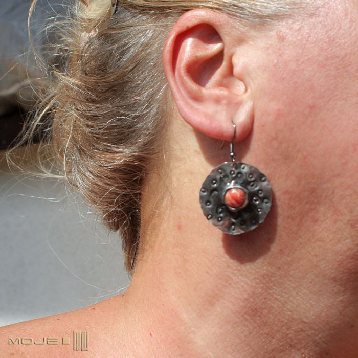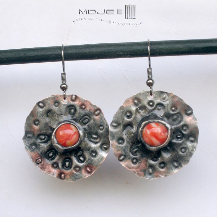 Okrągłe kolczyki z miedzi ze szklanym okiem. Kaboszony w pomarańczowym melanżu osadzone są na okrągłej miedzianej blasze z wybitymi znakami - młotkowanej, cynowanej, patynowanej i przecieranej. Blaszka jest cienka, a kolczyki dzięki temu lekkie. Metalowe bigle.