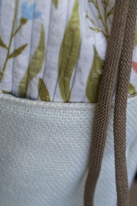 Workoplecak z jasnego grubego sztruksu w kwiaty.