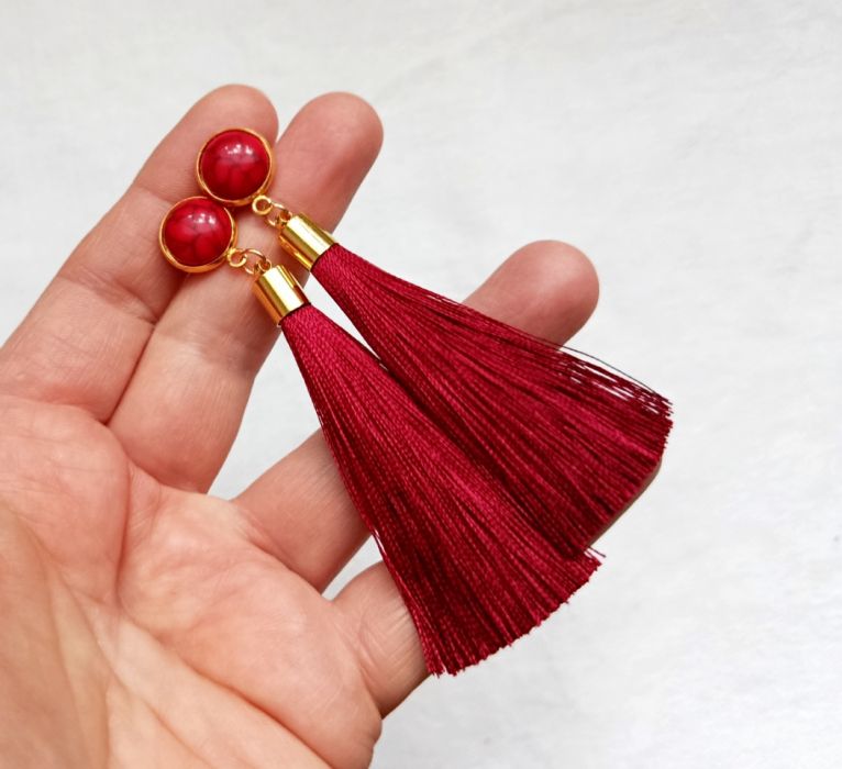 Kolczyki z zapięciem sztyft z chwostami w kolorze bordowym lub czerwonym - do wyboru. Długość chwosta 6,5 cm, są bardzo ładne z nici wiskozowej o podwyższonym połysku.