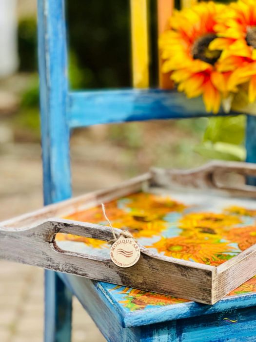 Intensywny kolor słoneczników i mocne przetarcia farb to wyróżniające się cechy drewnianej tacy o wymiarach 40 cm x 30 xm