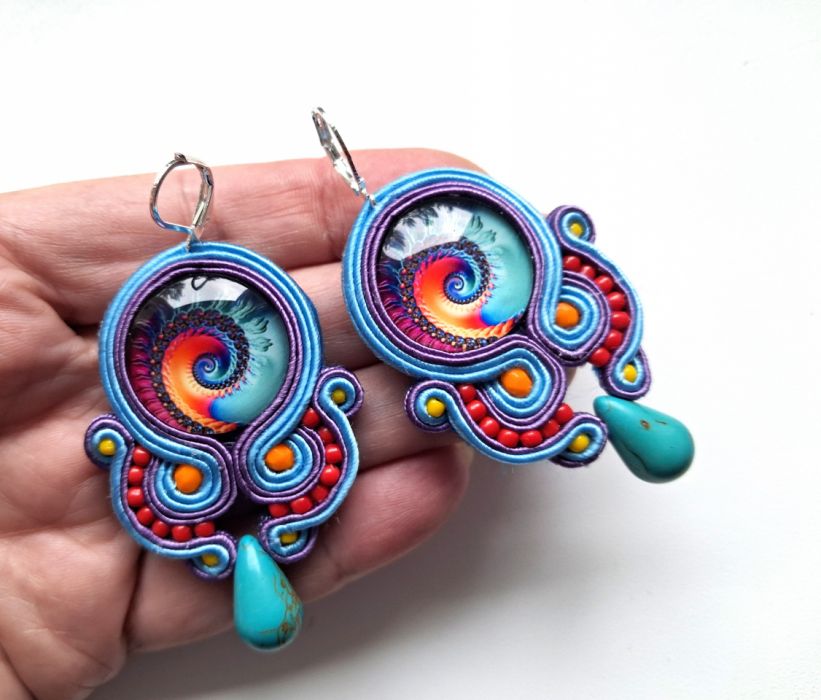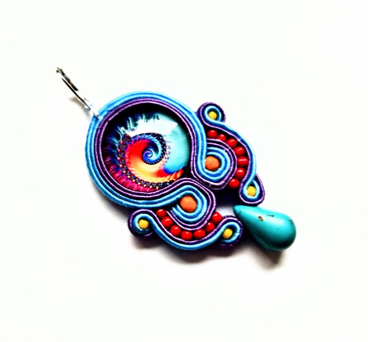 Kolczyki wykonane w modnej technice haftu sutaszowego. Jest ona pracochłonna, ale daje piękne efekty.