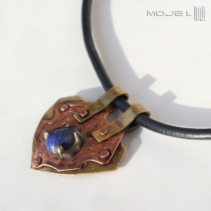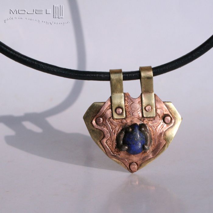 Miedź i mosiądz w czystej formie, uformowane w dynamiczny trójkątny kształt, częściowo trawione. Ozdobą jest łza lapis lazuli w kolorze granatowym ze złotymi drobinkami.
