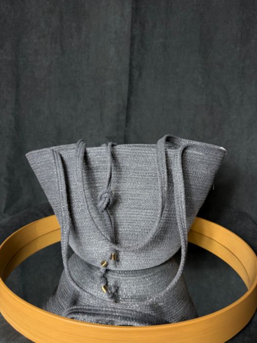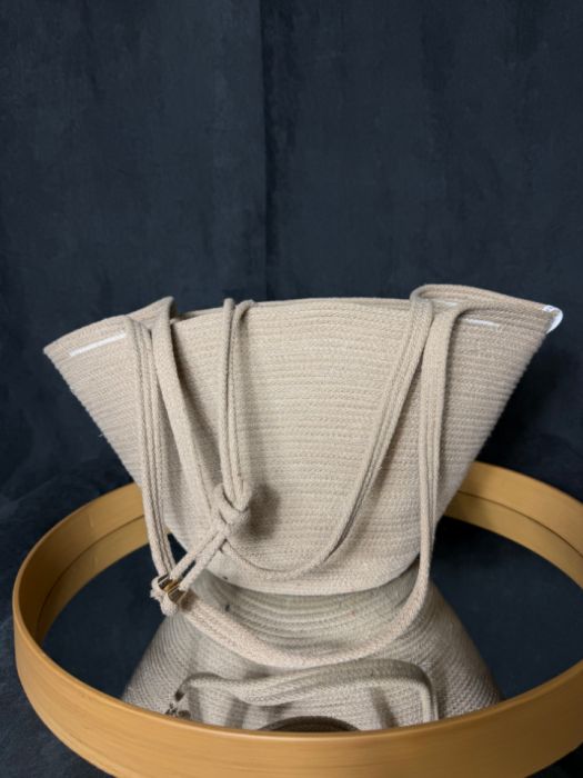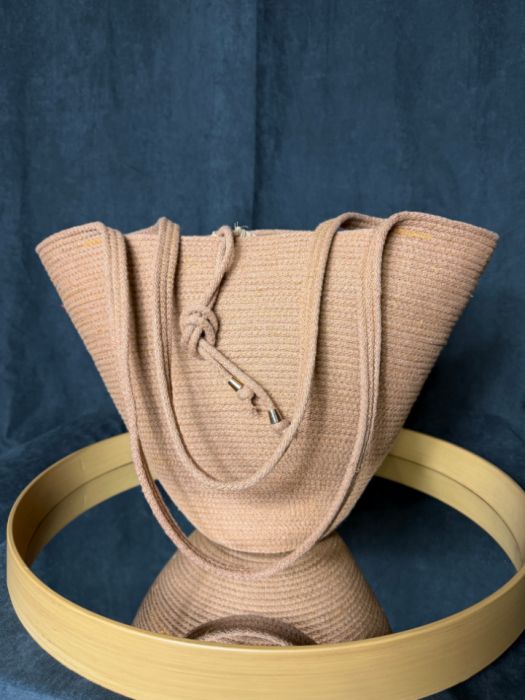 Torebka wykonana jest z grubego, miękkiego sznurka bawełnianego, dzięki czemu całość wygląda elegancko, ale nie przesadnie. Materiał dobrze trzyma formę, jest trwały, lekki i odporny na codzienne użytkowanie. W zestawie znajduje się jasna kosmetyczka–wkład, która pomaga zachować porządek wewnątrz torby.