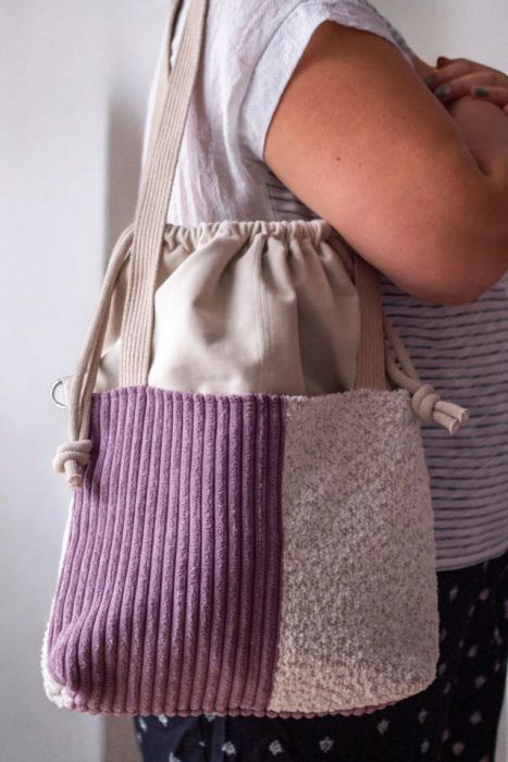 Torba worek wykonana z weluru, tkaniny typu "baranek" oraz grubego sztruksu. Stworzona w duchu no waste.