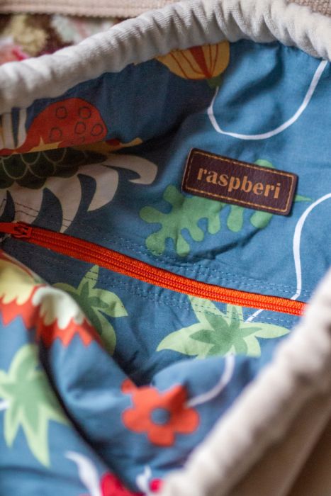 Ściągana jest jak worek bawełnianym sznurkiem w kolorze beżowym. Dół daje dodatkowe miejsce na przechowywanie rzeczy - z przodu dwie mniejsze, z tyłu torby jedna duża kieszeń.