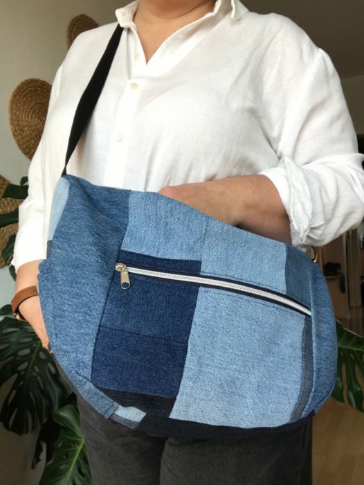 Ta torebka powstała z recyklingowanych spodni jeansowych.