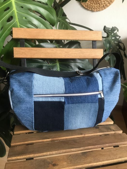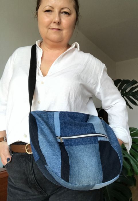 Ta torebka powstała z recyklingowanych spodni jeansowych.