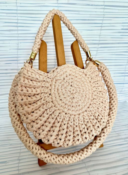 Torebka ręcznie wykonana na szydełku z bawełnianej włóczki T-shirt-owej w kolorze ciepłego ecru. Szerokość torebki 27 cm, wysokość - 21 cm. Torebka z dwoma paskami: 67 cm i 35 cm. Możliwość doczepienia również innych pasków (nie dołączonych do torebki). Przy pasku doczepione żółte serduszko jako ozdobny błyszczący element. Torebka zapinana na zatrzask magnetyczny. W środku doczepiony sznureczek z karabińczykiem do doczepienia np. kluczy, żeby łatwiej je wyjąć. Torebka miękka, miła w dotyku.