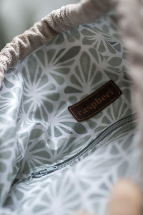 Bawełniana, wzorzysta podszewka. Torbę do wózka można zamocować dzięki specjalnym bawełnianym pasom zapinanym na karabińczyki.