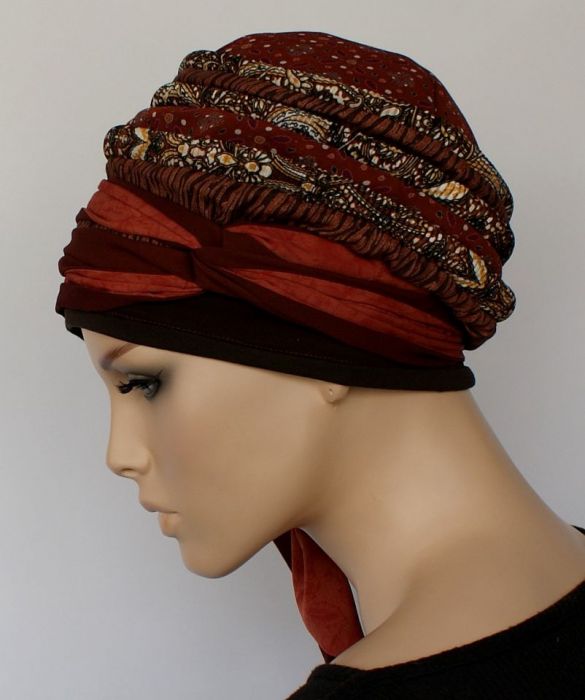 Lekki turban uszyty z cieniutkich materiałów, na delikatnej podszewce z batystu. Połączenie różnych gatunków tkanin. Doskonałe nakrycie głowy na dzień i wieczór, plażę w kurorcie, centrum wielkiego miasta lub do ogródka... WYJŚCIE AWARYJNE jeśli zabrakło wody w kranie albo nie zdążyłaś zadbać o fryzurę. Ucieczka od peruki dla kobiet po chemioterapii. Lekki, przewiewny, w uniwersalnym rozmiarze, z możliwością różnych wariantów zamotania mobilnej szarfy (można nosić jak czapkę, bez szarfy przewleczonej przez szlufkę z tyłu). Specjalna konstrukcja pozwala zachować właściwą formę po praniu.