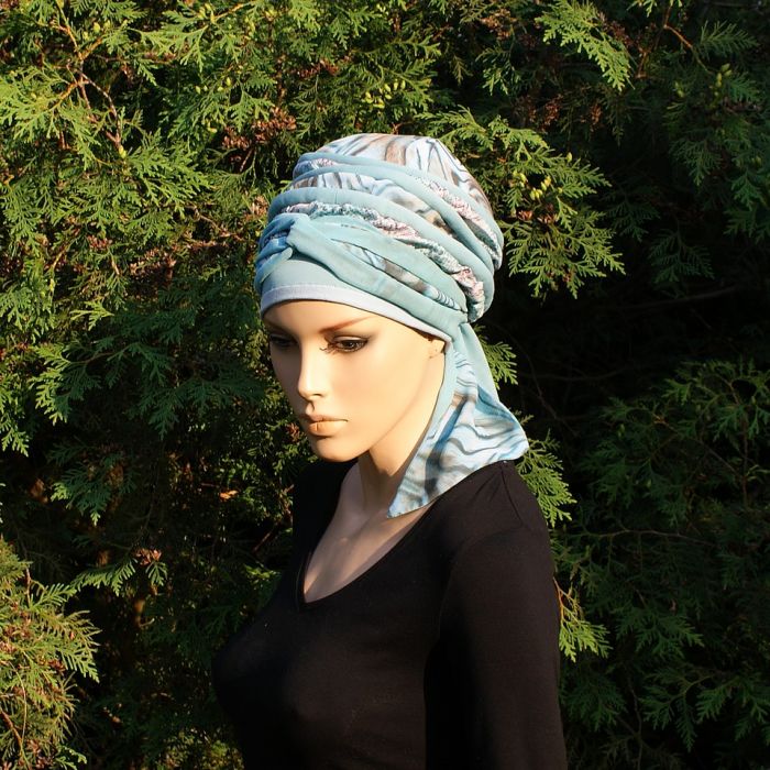 Lekki turban uszyty z cieniutkich materiałów, na delikatnej podszewce z batystu. Połączenie różnych gatunków tkanin. Doskonałe nakrycie głowy na dzień i wieczór, plażę w kurorcie, centrum wielkiego miasta lub do ogródka... WYJŚCIE AWARYJNE jeśli zabrakło wody w kranie albo nie zdążyłaś zadbać o fryzurę. Ucieczka od peruki dla kobiet po chemioterapii. Lekki, przewiewny, w uniwersalnym rozmiarze, z możliwością różnych wariantów zamotania mobilnej szarfy (można nosić jak czapkę, bez szarfy przewleczonej przez szlufkę z tyłu). Specjalna konstrukcja pozwala zachować właściwą formę po praniu.