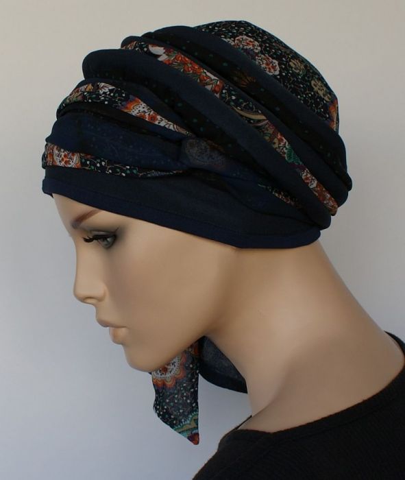 Lekki turban uszyty z cieniutkich materiałów, na delikatnej podszewce z batystu. Połączenie różnych gatunków tkanin. Doskonałe nakrycie głowy na dzień i wieczór, plażę w kurorcie, centrum wielkiego miasta lub do ogródka... WYJŚCIE AWARYJNE jeśli zabrakło wody w kranie albo nie zdążyłaś zadbać o fryzurę. Ucieczka od peruki dla kobiet po chemioterapii. Lekki, przewiewny, w uniwersalnym rozmiarze, z możliwością różnych wariantów zamotania mobilnej szarfy (można nosić jak czapkę, bez szarfy przewleczonej przez szlufkę z tyłu). Specjalna konstrukcja pozwala zachować właściwą formę po praniu.