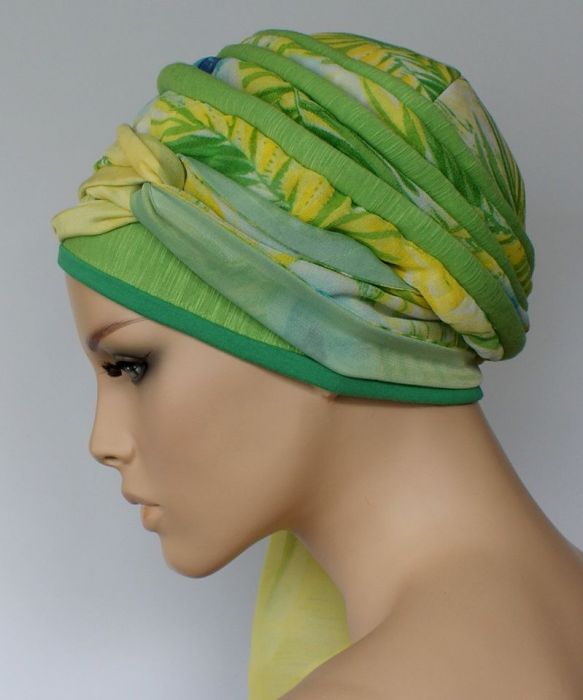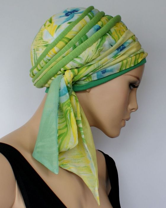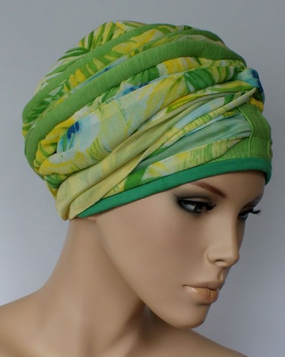 Letni turban uszyty z cieniutkich materiałów, na delikatnej podszewce z batystu. Połączenie różnych gatunków tkanin. Doskonałe nakrycie głowy na dzień i wieczór, plażę w kurorcie, centrum wielkiego miasta lub do ogródka... WYJŚCIE AWARYJNE jeśli zabrakło wody w kranie albo nie zdążyłaś zadbać o fryzurę. Ucieczka od peruki dla kobiet po chemioterapii. Lekki, przewiewny, w uniwersalnym rozmiarze, z możliwością różnych wariantów zamotania mobilnej szarfy (można nosić jak czapkę, bez szarfy przewleczonej przez szlufkę z tyłu). Specjalna konstrukcja pozwala zachować właściwą formę po praniu.