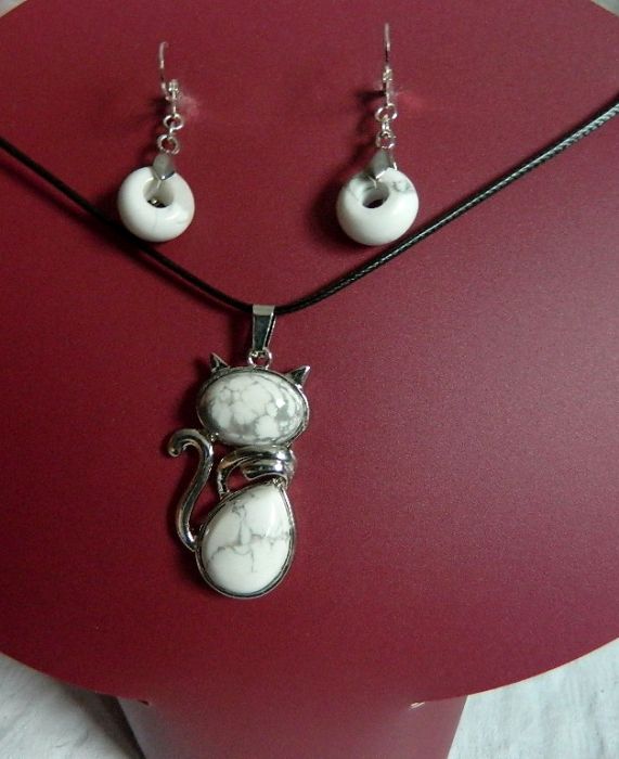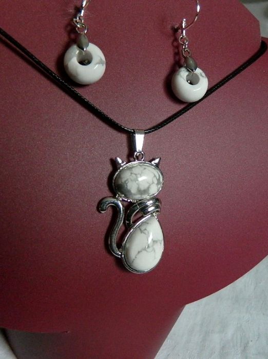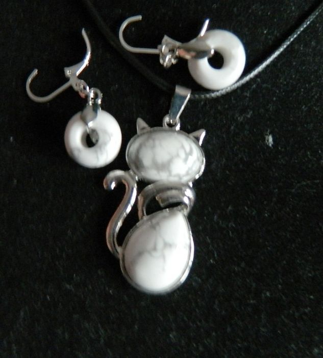 Zadaj pytanie dotyczące produktu: Turkus biały, wisiorek z kotkiem i kolczyki, komplet