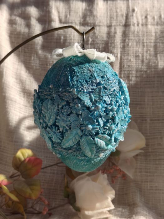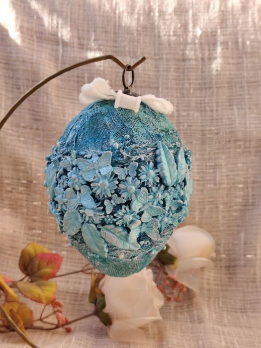 Błękitna Łąka to wyjątkowa, ręcznie zdobiona pisanka, która zachwyca świeżością koloru i bogactwem detali. Intensywny odcień turkusu przeplata się z subtelnymi przetarciami, tworząc efekt artystycznej głębi i lekkości. Kompozycja przestrzennych motyli, kwiatów oraz liści otula całą formę, nadając jej romantyczny, a jednocześnie elegancki charakter. To dekoracja, która przyciąga spojrzenia i wprowadza do wnętrza wiosenną energię oraz nutę luksusu.