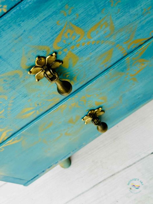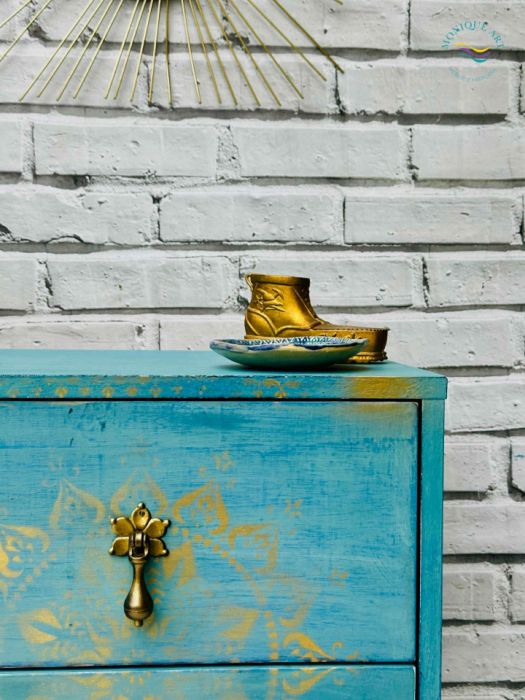 Turkusowa szafka w energetycznym klimacie orientu i oryginalnymi uchwytami , elegancka, subtelna i pełna wdzięku.