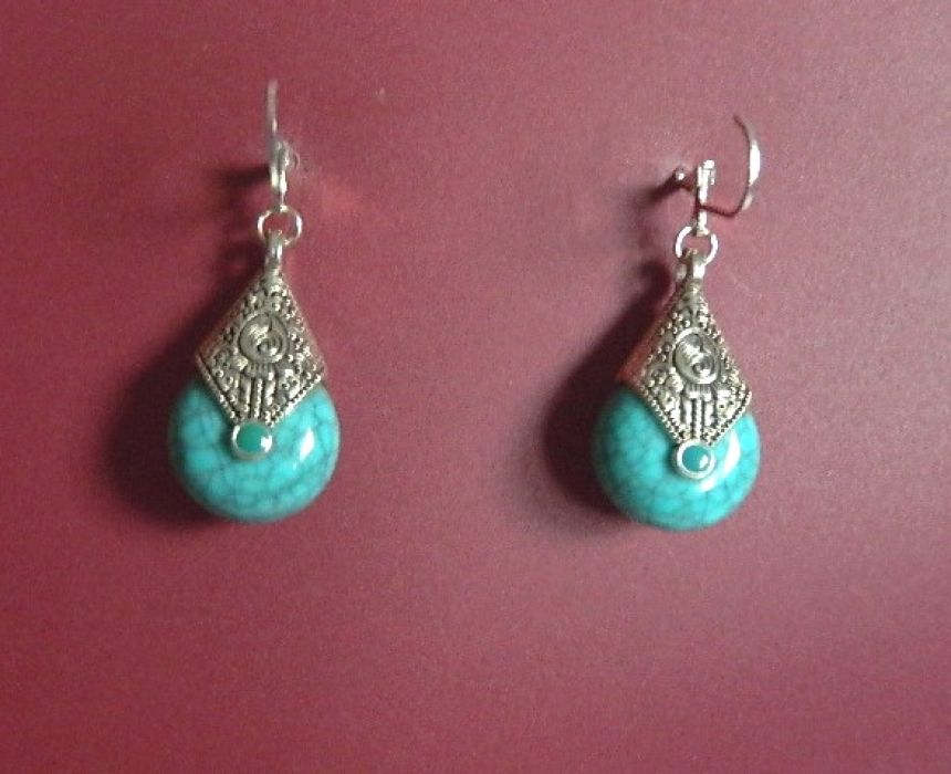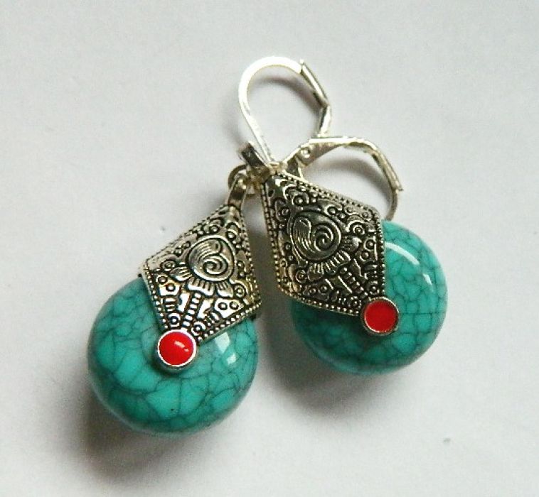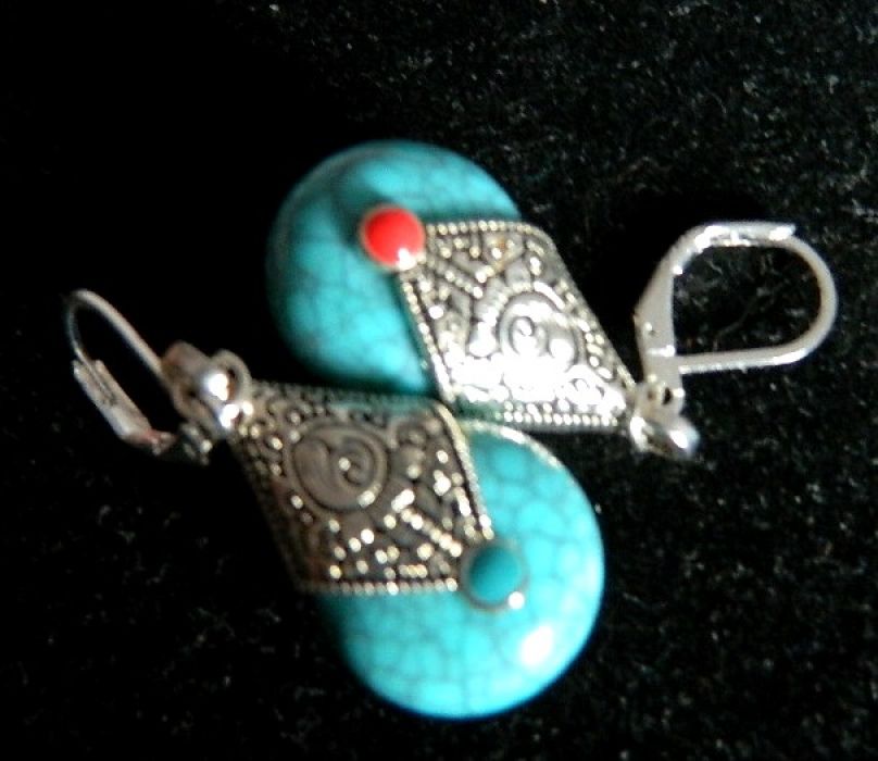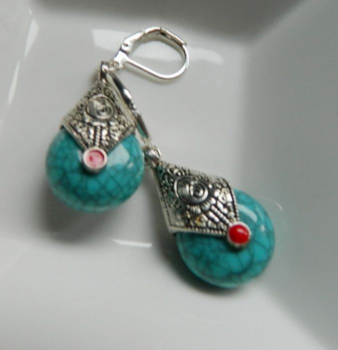 "Kamienie" imitujące turkus osadzone są w efektownym elemencie wykonanym z tybetańskiego srebra, jest on niewątpliwą ozdobą kolczyka. Łączenie "kamienia" z tymże elementem stanowią dwa kolory emalii - z jednej niebieskie z drugiej czerwone.