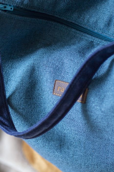 Średniej wielkości torebka w stylu boho. Worek zapinany na suwak z okrągłym, usztywnianym dnem wykonany z turkusowej tkaniny oraz miodowego weluru. Granatowe paski.