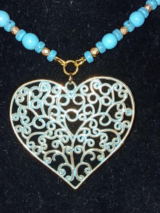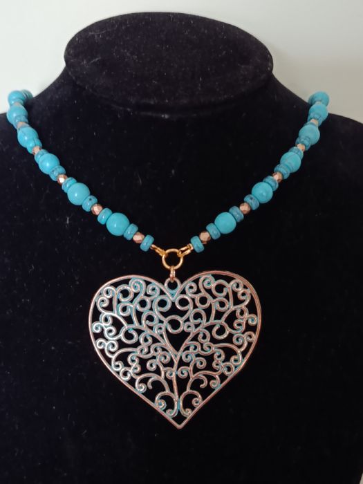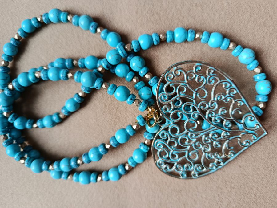Patynowane serce (6 x 5 cm) zawieszone na naszyjniku wykonanym z koralików - imitacja turkusów i małych złotych koralików. Długość naszyjnika to 82 cm plus długość zawieszki.