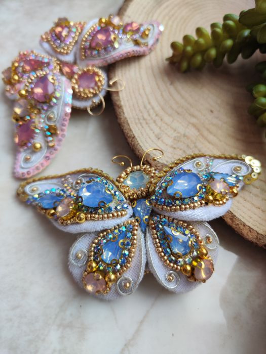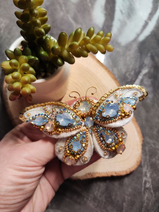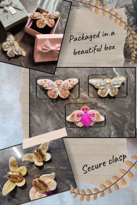 Ta luksusowa broszka w kształcie motyla to wyjątkowa, ręcznie robiona biżuteria artystyczna. Wykonana z aksamitnej tkaniny, ozdobiona ręcznie szklanymi koralikami, cyrkoniami oraz kryształowymi łańcuszkami. Trójwymiarowe skrzydełka nadają lekkość i wyjątkowy efekt przestrzenny. Tył wykończony miękką, ekologiczną skórą, a solidne zapięcie gwarantuje komfort i bezpieczeństwo noszenia.