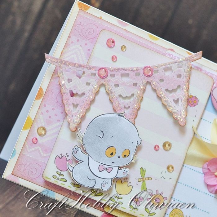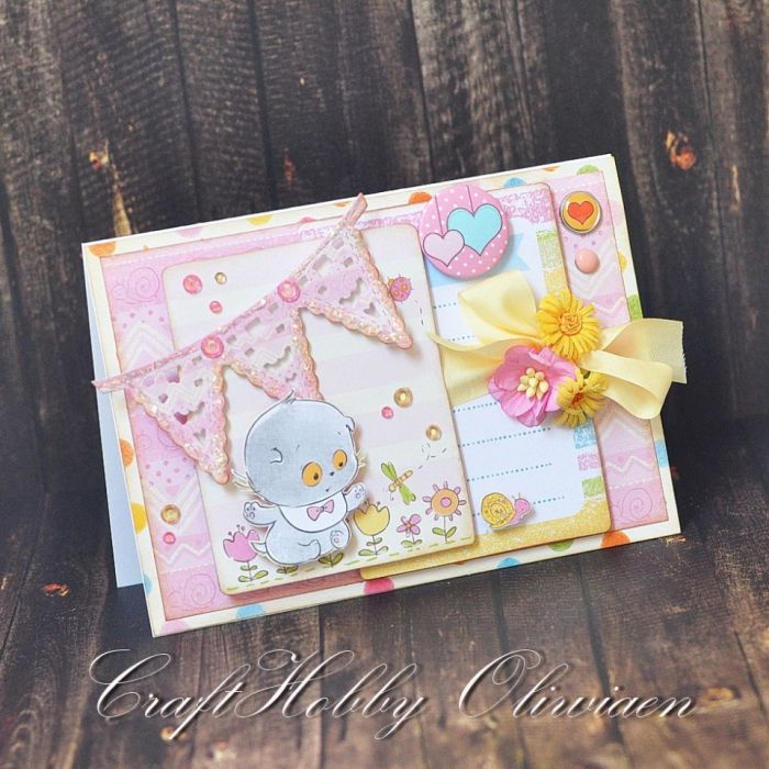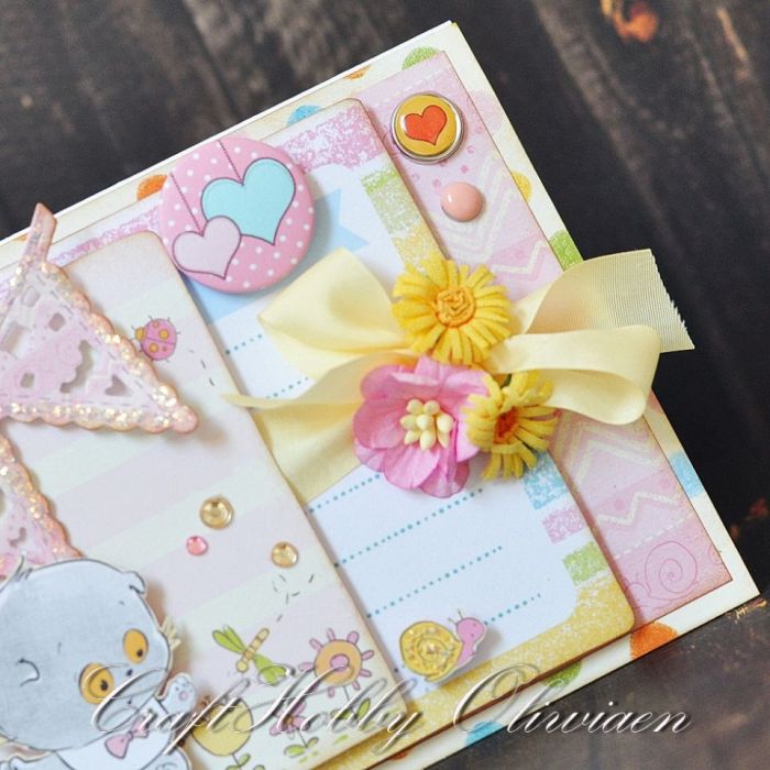 Urocza kartka urodzinowa dla małej dziewczynki. Wykonana z bezkwasowych papierów do scrapbookingu, z dodatkiem misternych wycinanek, ćwieków, kwiatów i brokatu. Efekt 3D, w komplecie koperta.