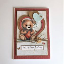 Ozdobiona grafiką misia z sercem, drewnianym guzikiem - kwiatkiem, sznurkiem, balonikami i małymi motylkami. Oczka i nosek misia oraz serce, które trzyma dodatkowo pokryte mediami, dającymi efekt wypukłości.