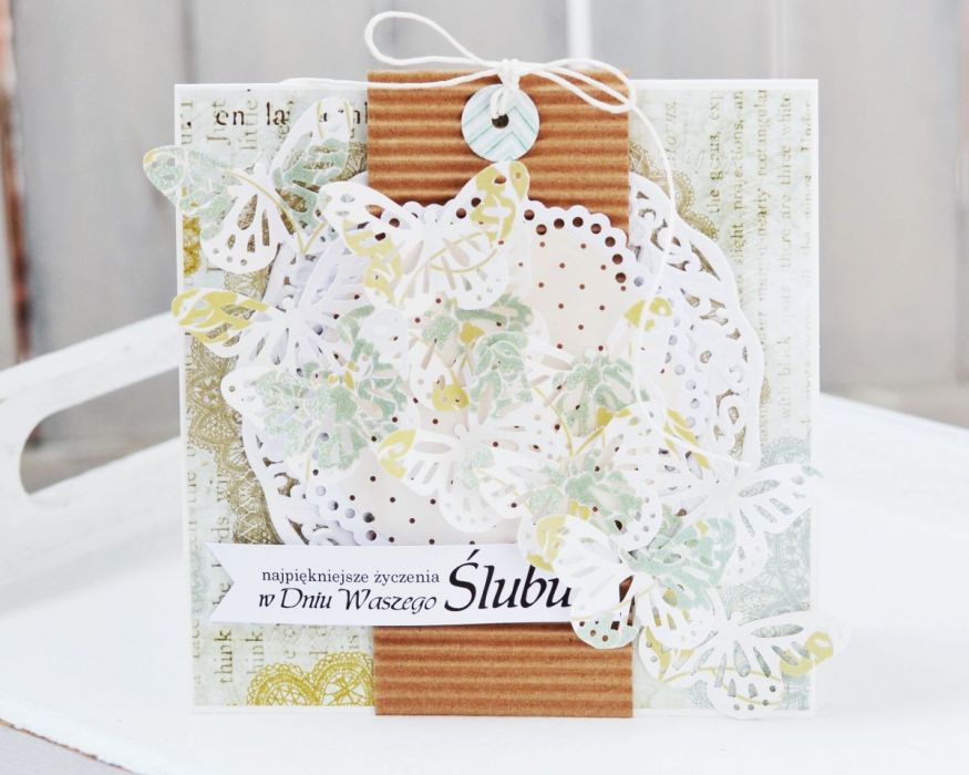 Wyjątkowa kartka z okazji Ślubu wykonana z najwyższej jakości papierów do scrapbookingu, ozdobiona przeszyciami maszynowymi i motylami 3D.