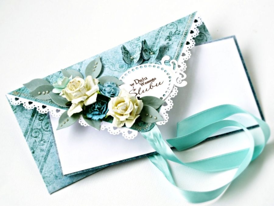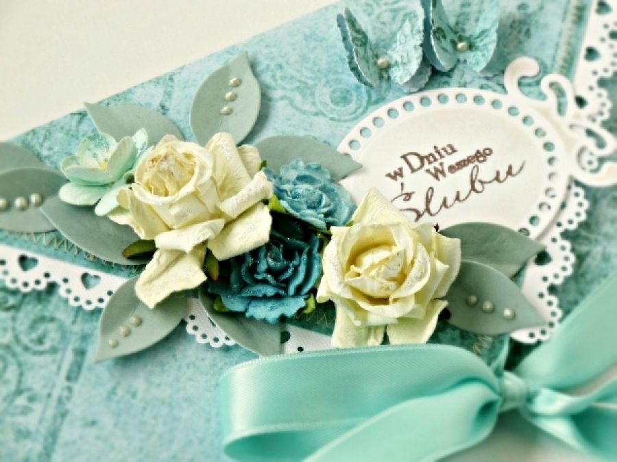 Wyjątkowa i elegancka, ręcznie zrobiona kartka-kopertówka pełna ślubnych życzeń. Przeszywana, bogato zdobiona motywem kwiatowym, z pewnością ucieszy obdarowanych. Serdecznie zapraszam.
