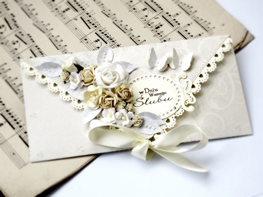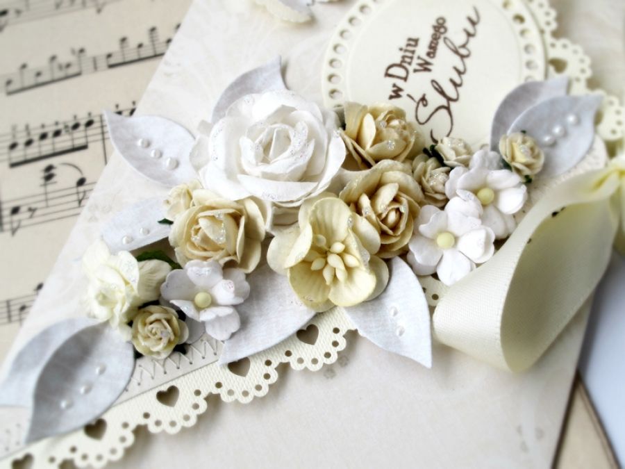 Wyjątkowa i elegancka, ręcznie zrobiona kartka-kopertówka pełna ślubnych życzeń. Przeszywana, bogato zdobiona motywem kwiatowym, z pewnością ucieszy obdarowanych. Serdecznie zapraszam.