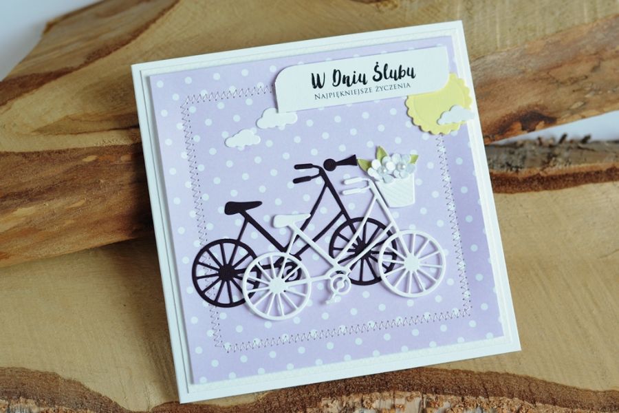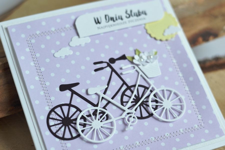 Kartka z okazji Ślubu z motywem dwóch rowerów:) Ozdobiona przeszyciami maszynowymi.