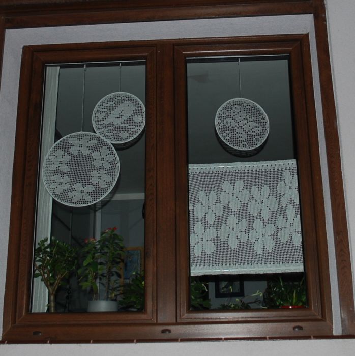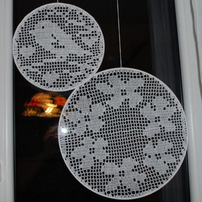 Zestaw dekoracyjny na okno wykonany na szydełku, w którego skład wchodzą: zazdrostka o wymiarach 55x47 cm oraz 3 obręcze 25cm, 25cm i 35 cm.