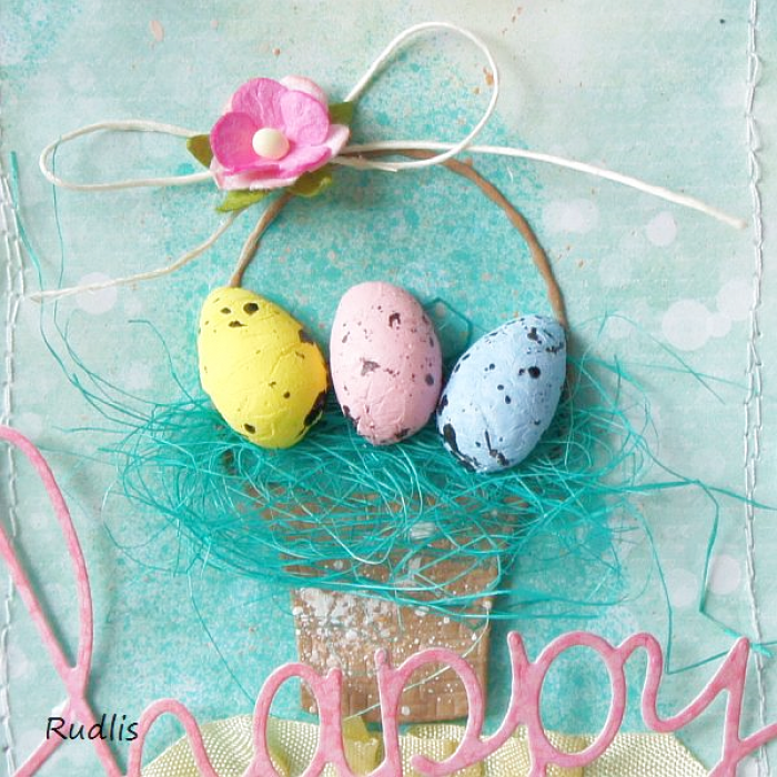 Wielkanocna kartka niebanalna. W radosnych, wiosennych kolorach z malutkimi, przestrzennymi jajeczkami.