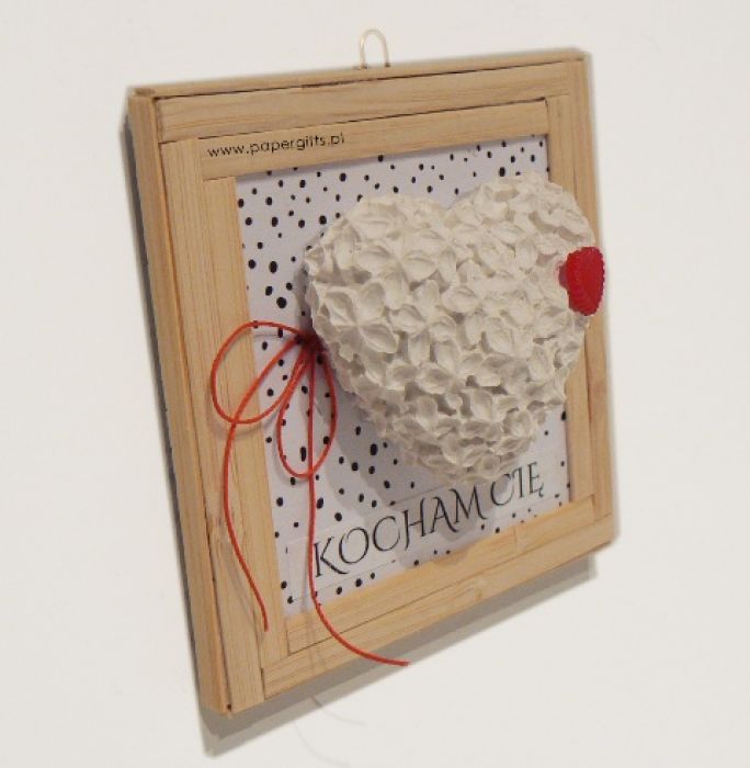 Ramka w rozmiarze 8,5 cm na 8,5 cm z haczykiem do powieszenia. Baza z tektury ozdobiona papierem w kwiaty, ozdobiona sercem 3D odlanym z gipsu ceramicznego, sznureczkiem oraz perłowym czerwonym serduszkiem. Całość wykończona drewnianymi patyczkami, ułożonymi w ramkę. Idealna na prezent dla kochanej osoby z okazji Walentynek, rocznicy lub po prostu tak bez okazji.
