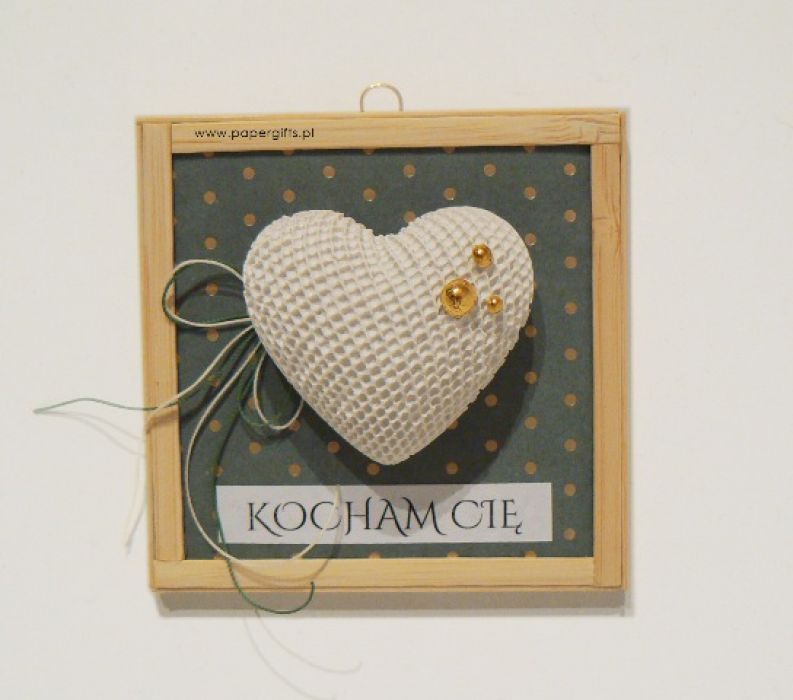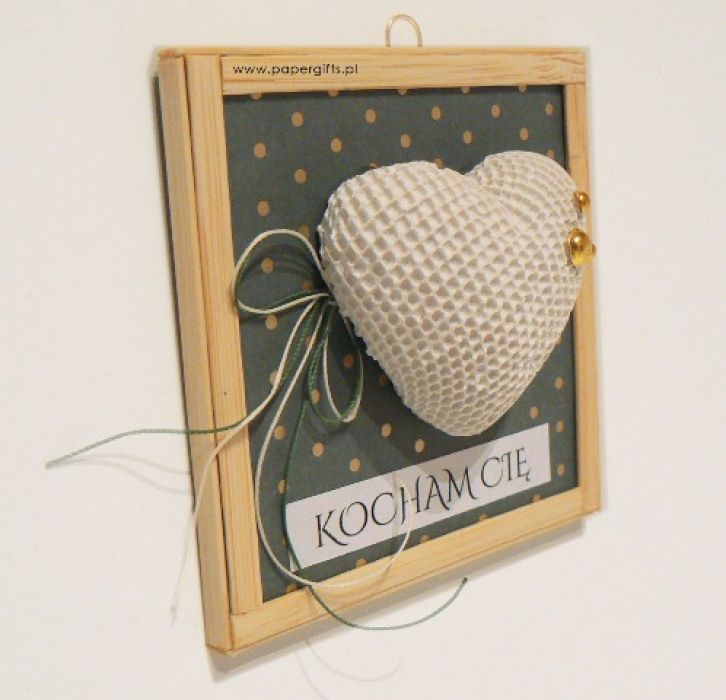 Ramka w rozmiarze 8,5 cm na 8,5 cm z haczykiem do powieszenia. Baza z tektury ozdobiona zielonym papierem złote kropki, ozdobiona sercem 3D odlanym z gipsu ceramicznego, sznureczkiem oraz złotymi perełkami. Całość wykończona drewnianymi patyczkami, ułożonymi w ramkę. Idealna na prezent dla kochanej osoby z okazji Walentynek, rocznicy lub po prostu tak bez okazji.