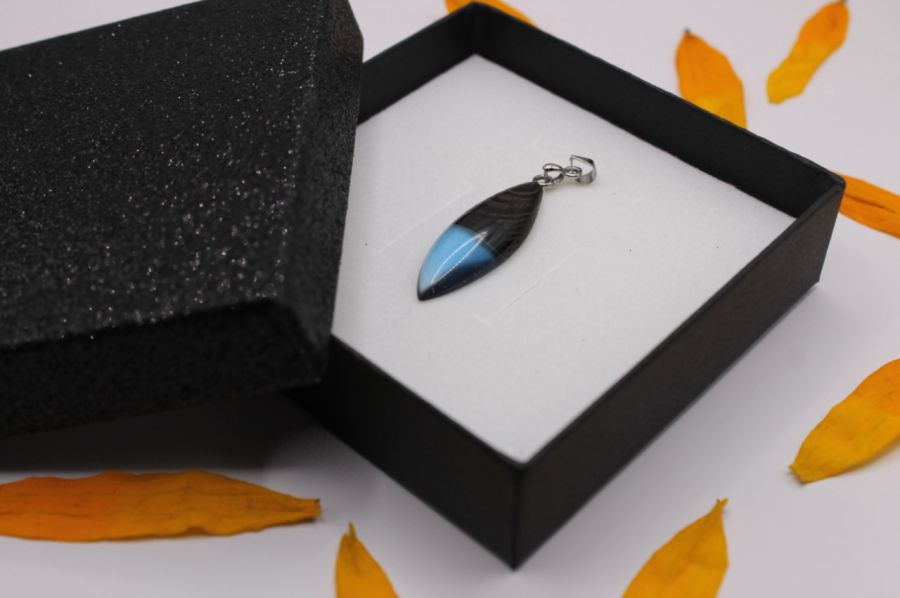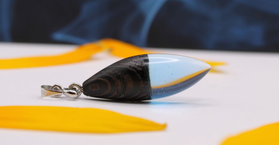 Unikalny wisiorek wykonany ręcznie z połączenia naturalnego drewna wenge i przezroczystej żywicy epoksydowej. Ciemna, wyrazista struktura egzotycznego drewna harmonijnie łączy się z chłodnym odcieniem błękitnej żywicy, tworząc wyjątkowy kontrast i nowoczesny charakter.