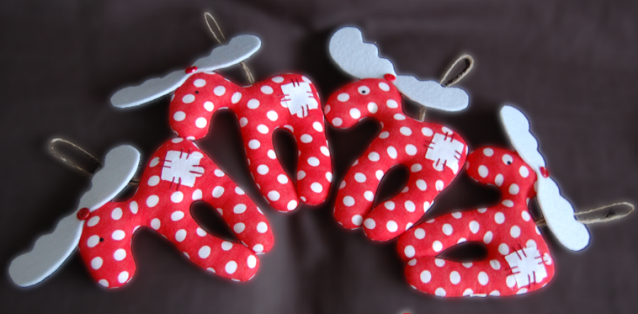 Wesołe renifery - mogą spełniać rolę choinkowych ozdób lub świątecznych zawieszek niekoniecznie umieszczonych na choince. Wykonane z czerwonej tkaniny w białe kropki (POLKA DOT), poroża z grubego filcu. Na grzbiecie zawieszka ze sznura jutowego. W środku wypełnienie poduszkowe. Oczka malowane czarną farbą do tkanin.