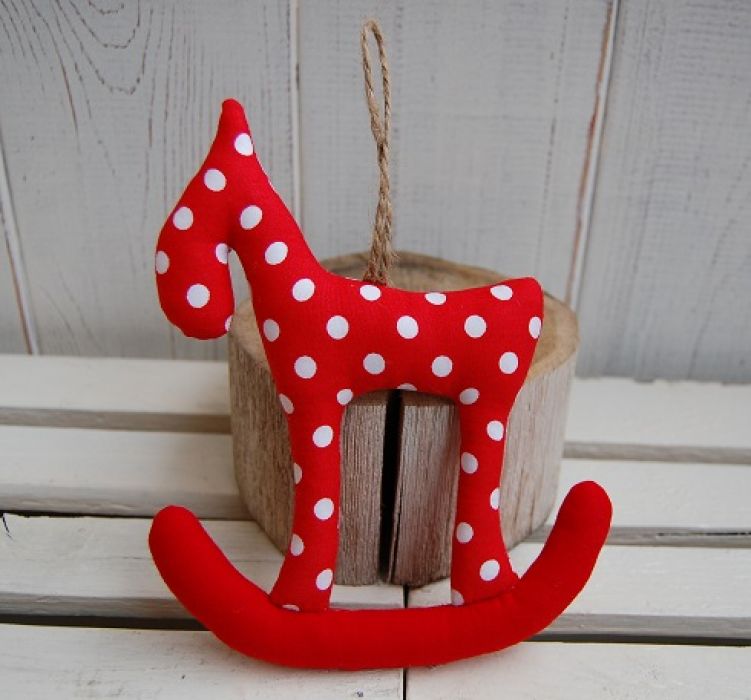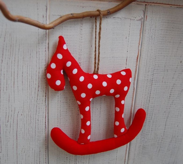 Wesoły konik na biegunach - może spełniać rolę choinkowej ozdoby lub świątecznej zawieszki niekoniecznie umieszczonej na choince. Korpus konika wykonany z czerwonej bawełny w białe kropki, biegun z jednolitej czerwonej. Zawieszka wykonana ze sznura jutowego. W środku wypełnienie poduszkowe.