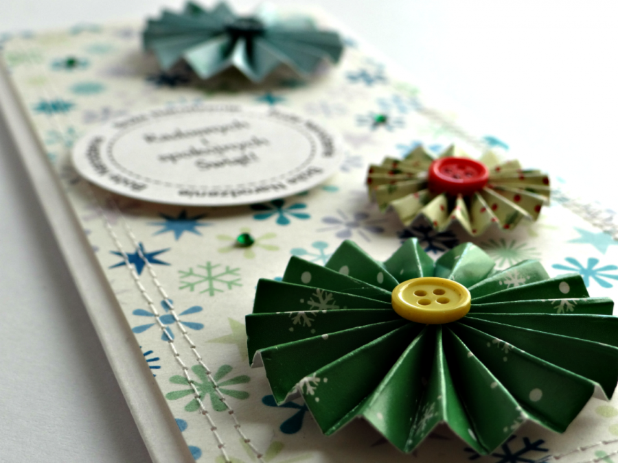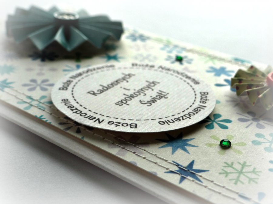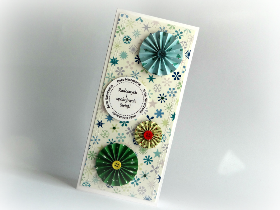 Wyjątkowa, ręcznie wykonana kartka bożonarodzeniowa o wymiarach 9,5 x 21 cm. Ozdobiona dekoracyjnym papierem, maszynowymi przeszyciami oraz kolorowymi wachlarzykami w kształcie koła. Kartka została wykonana starannie z dbałością o każdy detal, posiada elementy 3d. W środku znajduje się wkładka na życzenia. Sprzedawana w komplecie z kopertą i zabezpieczona folią ochronną.