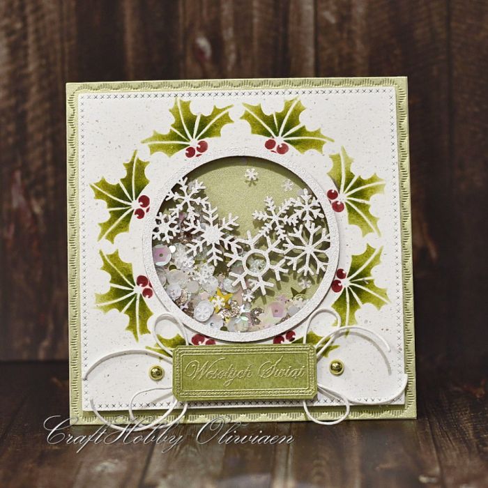 Wyjątkowa, oryginalna kartka świąteczna z okazji Bożego Narodzenia. Wykonana z bezkwasowych papierów do scrapbookingu, ozdobiona tłem z tuszowanym wiankiem ostrokrzewu i shaker-boxem z embossowaną tekturkową ramką ze śnieżynkami, wypełnioną cekinami, stemplowanym i embossowanym napisem, złotymi perełkami i sznureczkiem. Całość pięknie mieni się i skrzy pod światło.