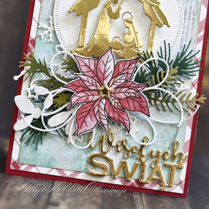 Wyjątkowa, oryginalna kartka świąteczna z okazji Bożego Narodzenia. Wykonana z bezkwasowych papierów do scrapbookingu, ozdobiona wycinanymi motywami poinsettii i gałązek, szopki i napisu ze złotego metalicznego kartonu, brokatowymi śnieżynkami i sznureczkiem. Całość pięknie mieni się i skrzy pod światło.