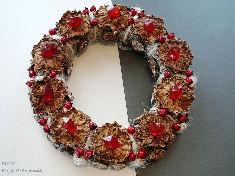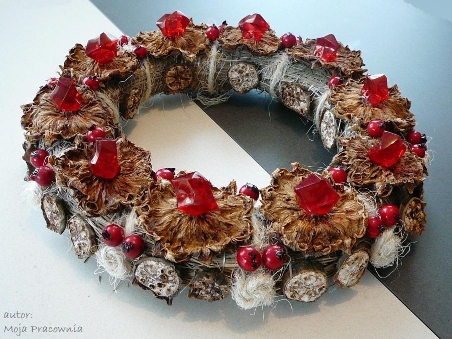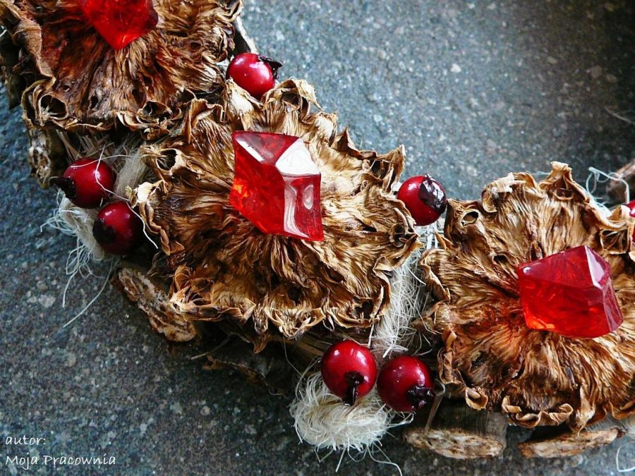 Wprowadzający w przedświąteczny klimat wianek, utrzymany w czerwono-kremowo-brązowej kolorystyce, z suszem egzotycznym, sznurkiem i wyrazistymi kryształkami. Do postawienia na stole, kominku, meblach itd.