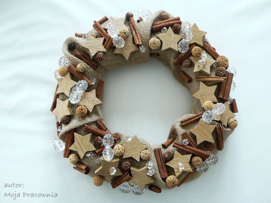 Utrzymany w kremowo-brązowej kolorystyce, świąteczny wianek z drewnianymi gwiazdkami, cynamonem, suszem i przezroczystymi kryształkami.