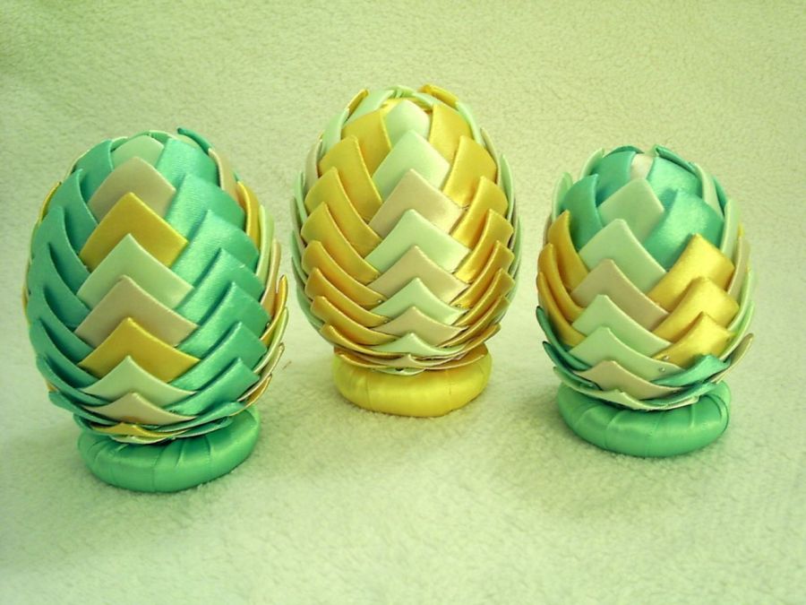Karczochowe pisanki ze wstążeczek na styropianowej formie, na podstawce - krążku, o łącznej wysokości razem z podstawką 2 x 9 cm i 1 x 8 cm.