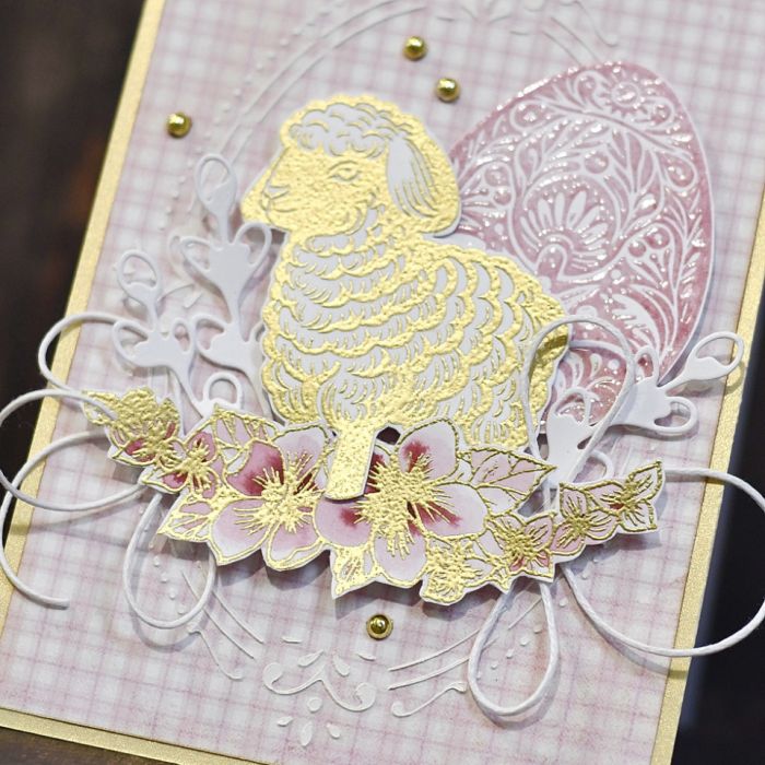 Wykonana z bezkwasowych papierów do scrapbookingu i złotego perłowego kartonu, ozdobiona wzorem naniesionym pastą modelującą na papier tła, stemplowanymi i embossowanymi motywami, sznureczkiem i złotymi perełkami.