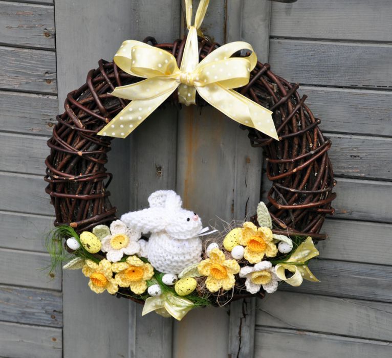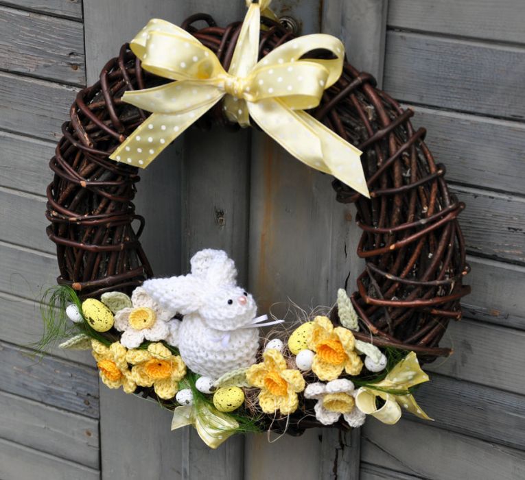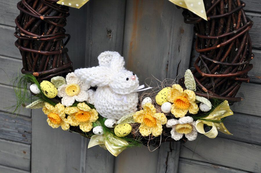 Piękny i wyjątkowy wianek świąteczny z wikliny ozdobiony szydełkowym zającem i kwiatami oraz rafią, jajeczkami z tworzywa, wstążkami; średnica 35cm; wianek przystosowany do powieszenia na drzwiach lub w oknie; wianki występują w pojedynczych egzemplarzach, nie możliwości powtórzenia wzoru; zapraszam serdecznie