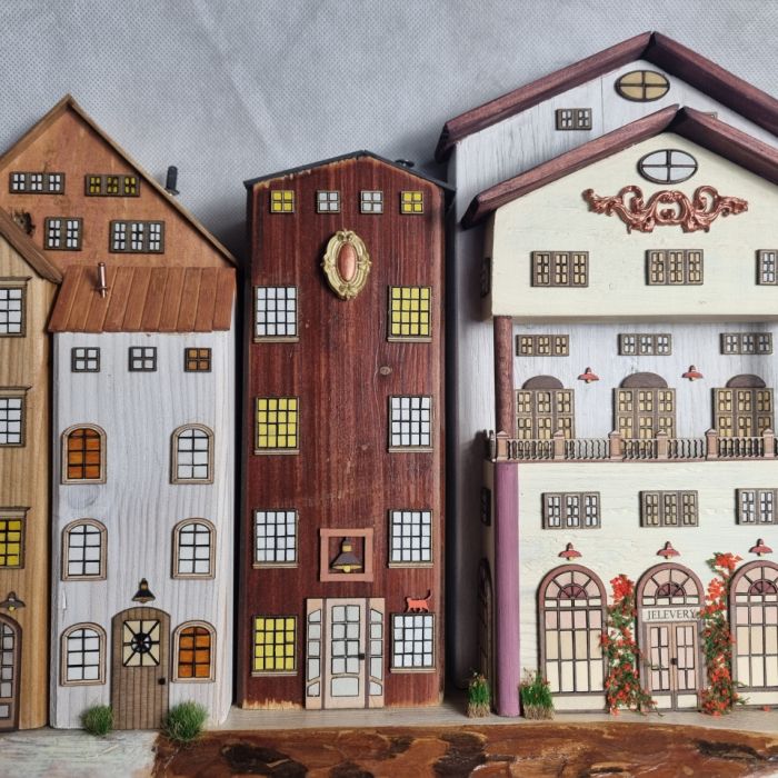Drewniane domki handmade, mogące służyć jako wieszak na klucze (5), ręczniki inne drobiazgi. Domki wykonane desek ze starych palet z odzysku. Drewno bejcowane, woskowane, malowane w różnych odcieniach - ładnie podkreślające starość drewna - malowane bezbarwną farbą akrylową. Drewniane, wycinane okna i drzwi, również inne detale. Długość 71 cm, wysokość 44 cm, szerokość 9 cm . Całość do zawieszenia na ścianie na 2 hakach. (13)