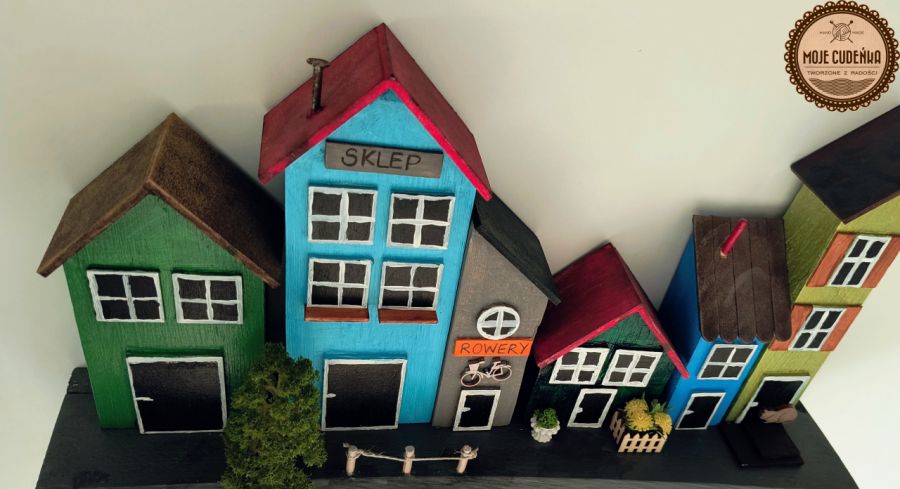 Wieszak z domkami 3D wykonany z drewna sosnowego, mogący służyć jako wieszak na klucze, ręczniki oraz inne drobiazgi. Drewno pełnowartościowe, malowane za pomocą farb akrylowych. Drewniane, wycinane okna i drzwi, oraz inne detale nadające całości niepowtarzalną kompozycję. Propozycja nietuzinkowego prezentu jak również oryginalna ozdoba każdego wnętrza. Długość 41 cm, wysokość (mierzona w najwyższym punkcie) 26 cm, grubość 9 cm . Całość do zawieszenia na ścianie na 2 haczykach.