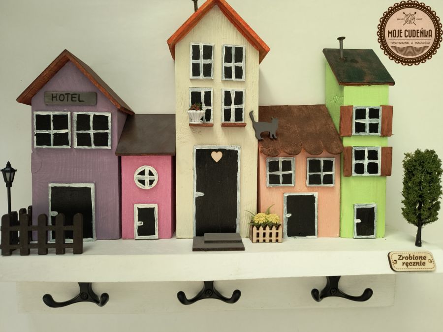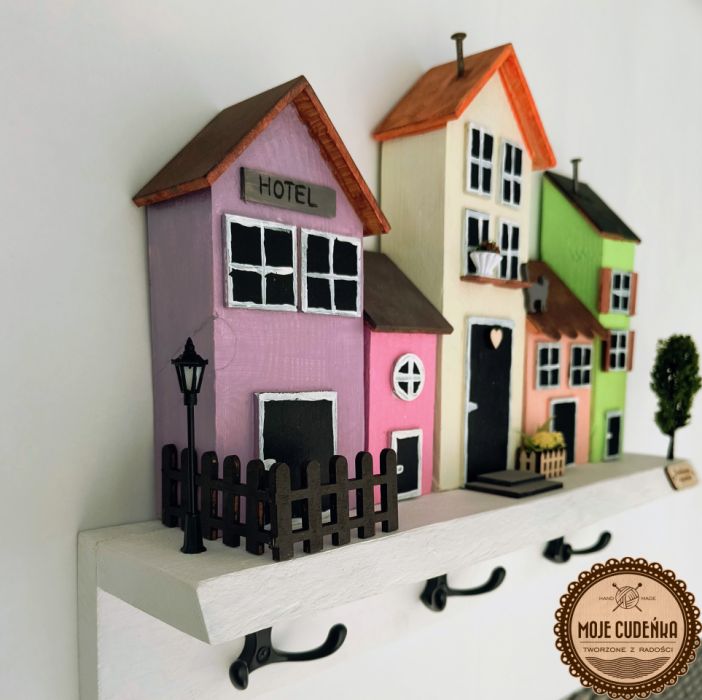 Wieszak z domkami 3D wykonany z drewna sosnowego, mogący służyć jako wieszak na klucze, ręczniki oraz inne drobiazgi. Drewno pełnowartościowe, malowane w odcieniach pastelowych farb akrylowych. Drewniane, wycinane okna i drzwi, oraz inne detale nadające całości niepowtarzalną kompozycję. Propozycja nietuzinkowego prezentu jak również oryginalna ozdoba każdego wnętrza. Długość 36 cm, wysokość (mierzona w najwyższym punkcie) 28 cm, grubość 8 cm . Całość do zawieszenia na ścianie na 2 haczykach.