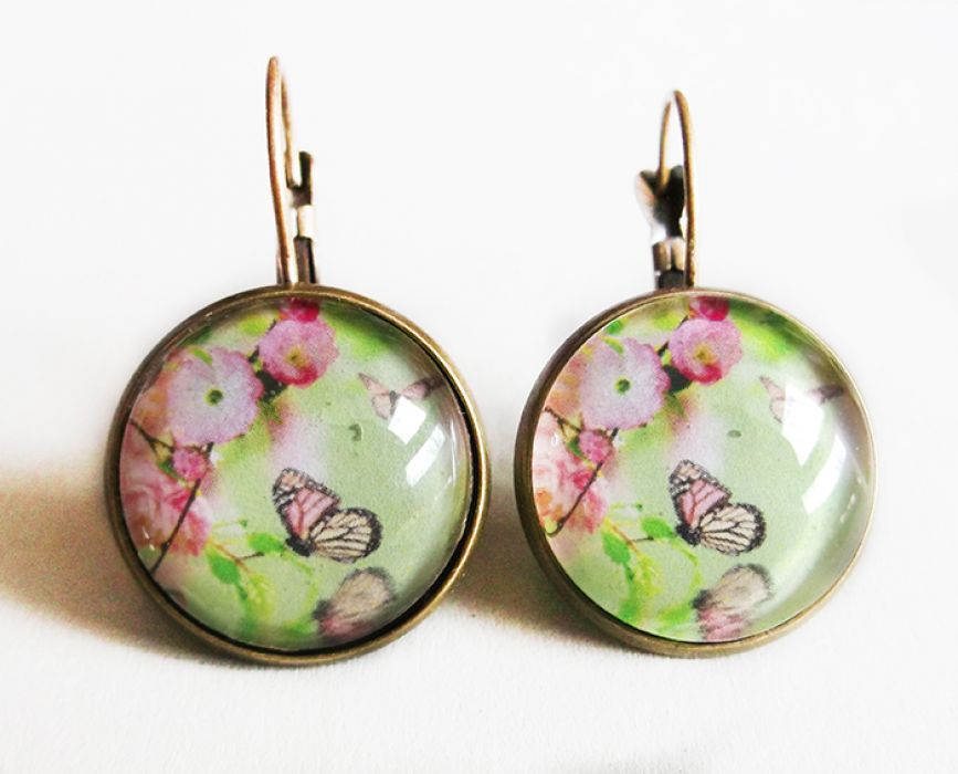 Romantyczne kolczyki z grafiką. Zamykane bigle, oprawa w kolorze mosiądzu. Metal: mosiądz.